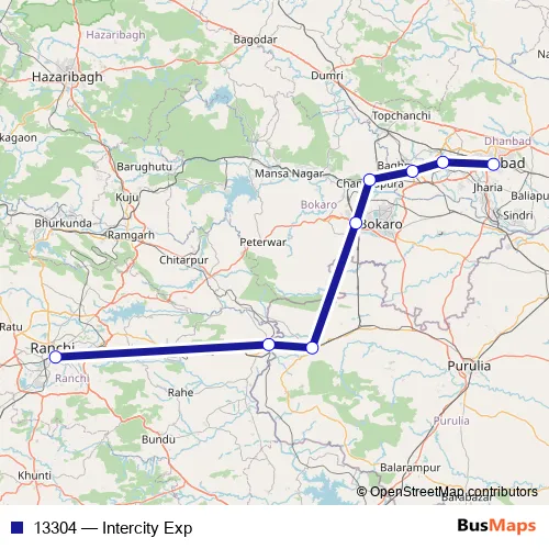 The first stop of the 13304 rail route is Ranchi and the last stop is Dhanbad Jn. 13304 (Intercity Exp) is operational during everyday.