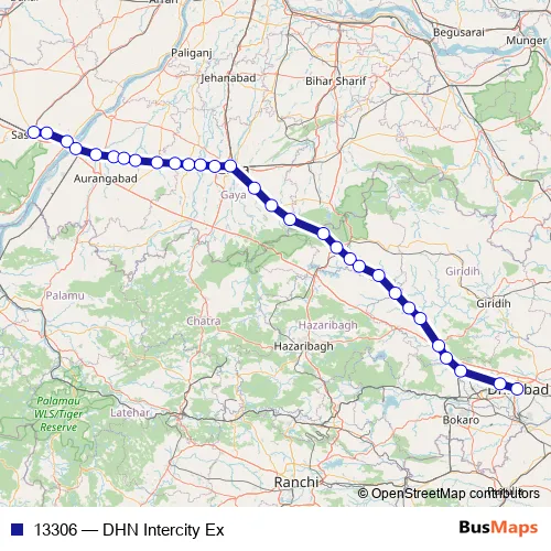 The first stop of the 13306 rail route is Sasaram and the last stop is Dhanbad Jn. 13306 (DHN Intercity Ex) is operational during everyday.