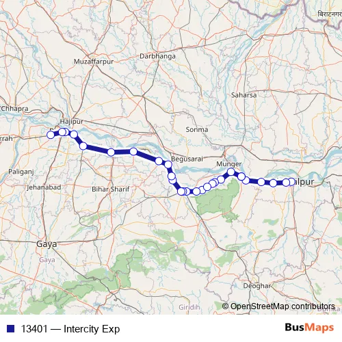 The first stop of the 13401 rail route is Bhagalpur and the last stop is Danapur. 13401 (Intercity Exp) is operational during everyday.