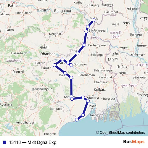 The first stop of the 13418 rail route is Malda Town and the last stop is Digha. 13418 (Mldt Dgha Exp) is operational during everyday.
