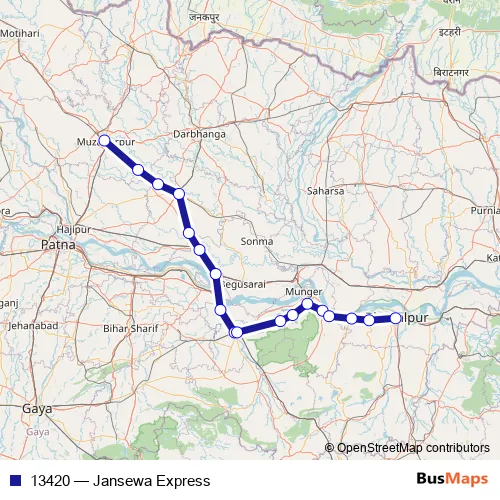 The first stop of the 13420 rail route is Muzaffarpur Jn and the last stop is Bhagalpur. 13420 (Jansewa Express) is operational during everyday.