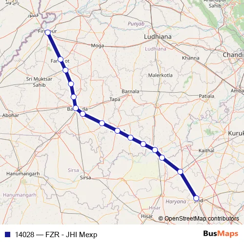 The first stop of the 14028 rail route is Firozpur Cant and the last stop is Jind Jn. 14028 (FZR - JHI Mexp) is operational during everyday.