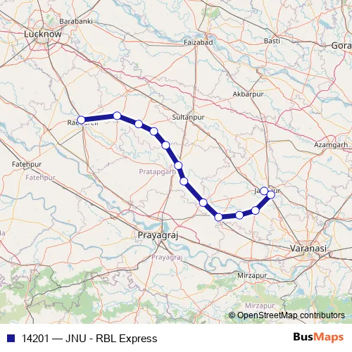 The first stop of the 14201 rail route is Jaunpur Jn and the last stop is RAE Bareli Jn. 14201 (JNU - RBL Express) is operational during everyday.