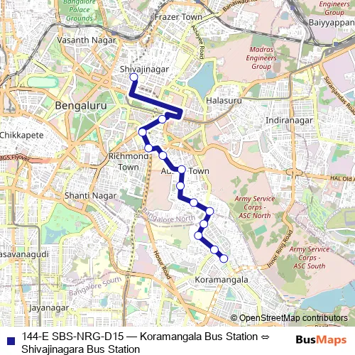 The first stop of the 144-E SBS-NRG-D15 bus route is Koramangala Bus Station and the last stop is Shivajinagara Bus Station. 144-E SBS-NRG-D15 (Koramangala Bus Station ⇔ Shivajinagara Bus Station) is operational during everyday.