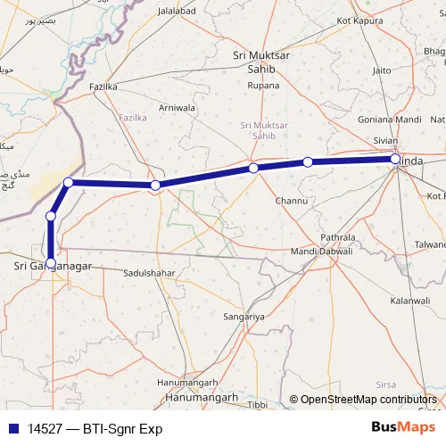 The first stop of the 14527 rail route is Bathinda and the last stop is Shri Ganganagar. 14527 (BTI-Sgnr Exp) is operational during on weekends.