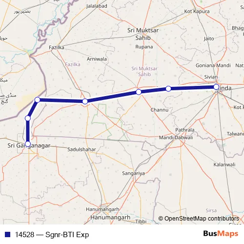 The first stop of the 14528 rail route is Shri Ganganagar and the last stop is Bathinda. 14528 (Sgnr-BTI Exp) is operational during on weekends.
