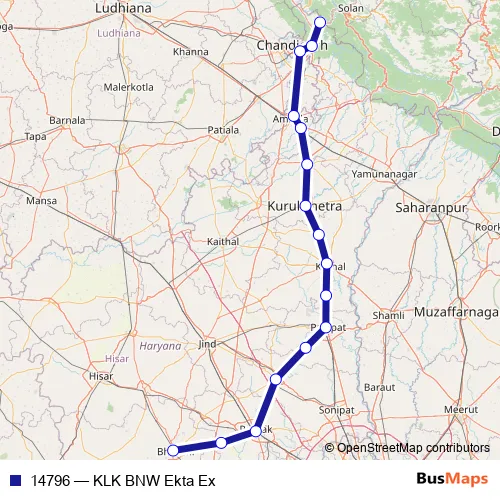 The first stop of the 14796 rail route is Kalka and the last stop is Bhiwani Jn.. 14796 (KLK BNW Ekta Ex) is operational during everyday.
