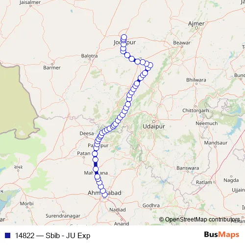 The first stop of the 14822 rail route is Sabarmati Bg and the last stop is Jodhpur Jn. 14822 (Sbib - JU Exp) is operational during everyday.