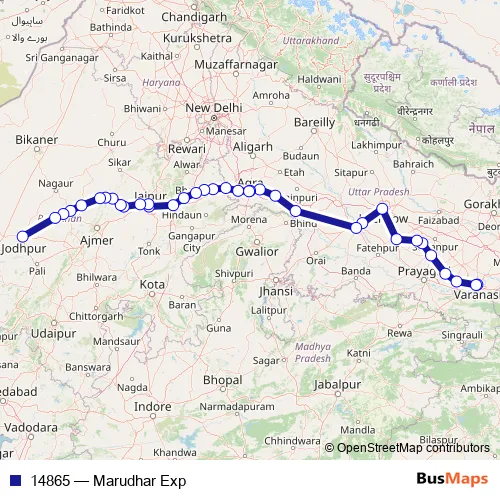 The first stop of the 14865 rail route is Varanasi City and the last stop is Jodhpur Jn. 14865 (Marudhar Exp) is operational during everyday.