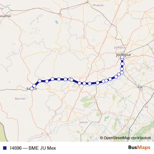 The first stop of the 14896 rail route is Barmer and the last stop is Bhagat KI Kothi. 14896 (BME JU Mex) is operational during everyday.