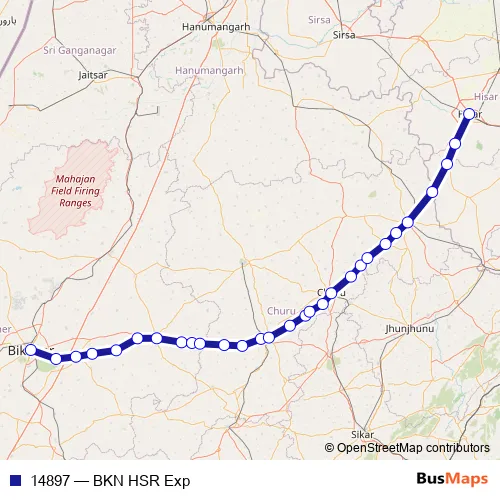 The first stop of the 14897 rail route is Bikaner Jn and the last stop is Hisar. 14897 (BKN HSR Exp) is operational during everyday.