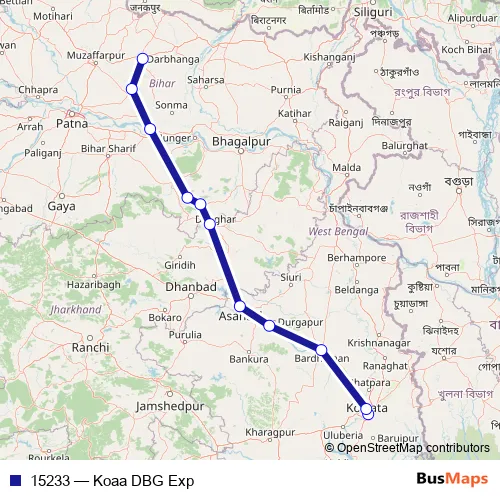 The first stop of the 15233 rail route is Kolkatta Terminal and the last stop is Darbhanga Jn. 15233 (Koaa DBG Exp) is operational during everyday.