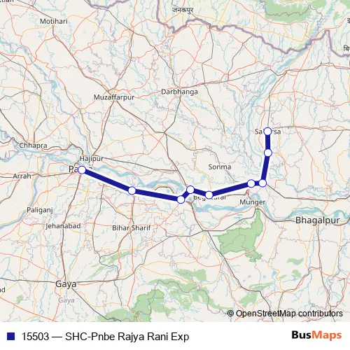 The first stop of the 15503 rail route is Saharsa Jn and the last stop is Patna Jn. 15503 (SHC-Pnbe Rajya Rani Exp) is operational during everyday.