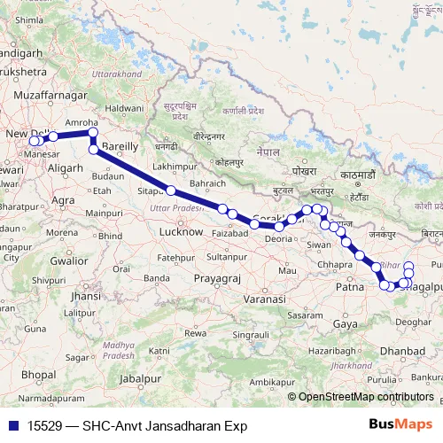 The first stop of the 15529 rail route is Saharsa Jn and the last stop is Anand Vihar Terminal. 15529 (SHC-Anvt Jansadharan Exp) is operational during everyday.