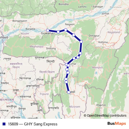 The first stop of the 15609 rail route is Guwahati and the last stop is Sairang. 15609 (GHY Sang Express) is operational during everyday.