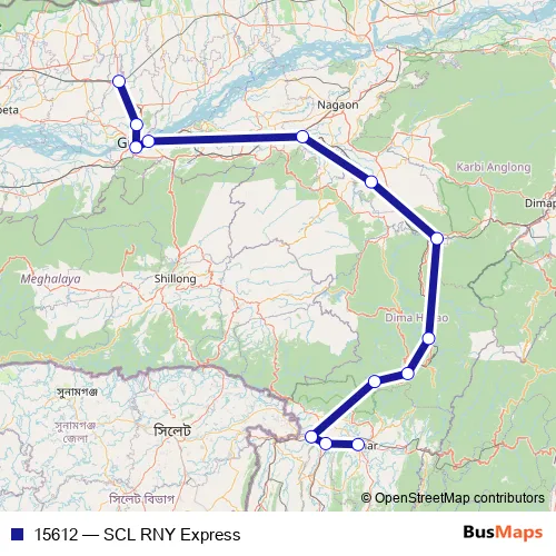 The first stop of the 15612 rail route is Silchar and the last stop is Rangiya Jn.. 15612 (SCL RNY Express) is operational during everyday.