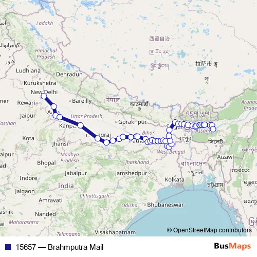 The first stop of the 15657 rail route is Delhi Jn. and the last stop is Kamakhya. 15657 (Brahmputra Mail) is operational during everyday.