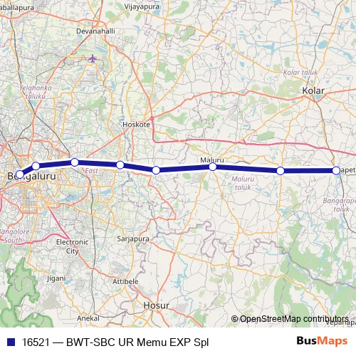 See why over 2 million users trust and consider busmaps.com as the best public transport website. busmaps gives you Bengaluru Rail Services suggested routes, real-time bus tracker, line route maps in Bengaluru, and helps to find the closest 16521 rail stops near you. No internet available? Download an offline PDF map and bus schedule for the 16521 rail to take on your trip.