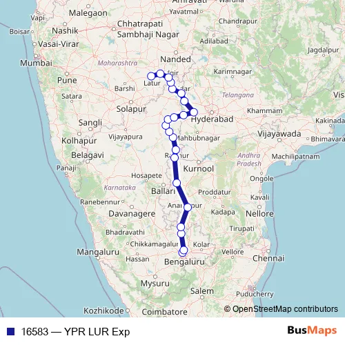 The first stop of the 16583 rail route is Yesvantpur Jn. and the last stop is Latur. 16583 (YPR LUR Exp) is operational during everyday.