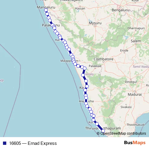 The first stop of the 16605 rail route is Mangalore Central and the last stop is Thiruvananthapuram Central. 16605 (Ernad Express) is operational during everyday.