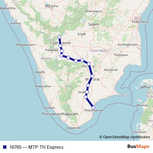 The first stop of the 16765 rail route is Metupalaiyam and the last stop is Tuticorin. 16765 (MTP TN Express) is operational during everyday.