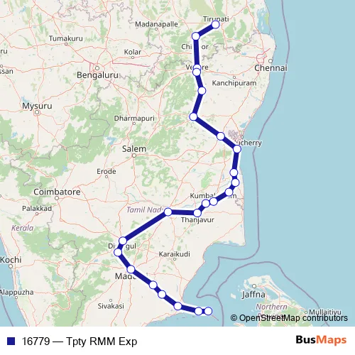 The first stop of the 16779 rail route is Tirupati and the last stop is Rameswaram. 16779 (Tpty RMM Exp) is operational during everyday.