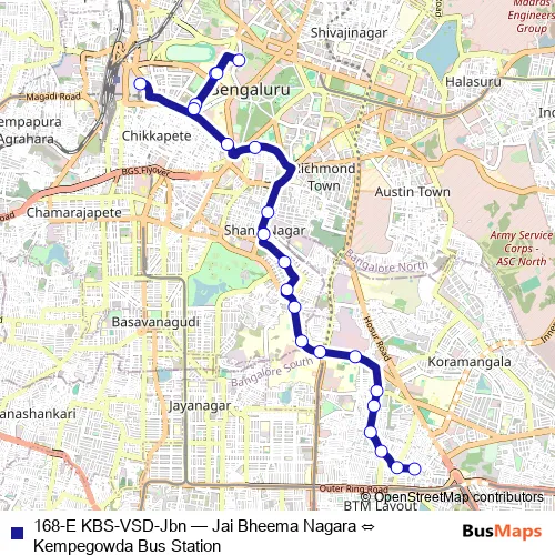 The first stop of the 168-E KBS-VSD-Jbn bus route is Jai Bheema Nagara and the last stop is Kempegowda Bus Station. 168-E KBS-VSD-Jbn (Jai Bheema Nagara ⇔ Kempegowda Bus Station) is operational during everyday.