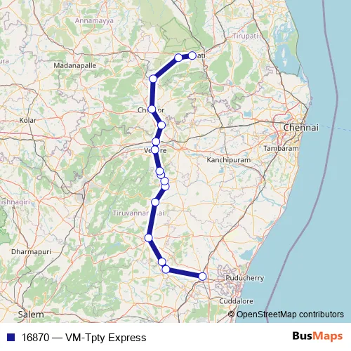 The first stop of the 16870 rail route is Villupuram Jn and the last stop is Tirupati. 16870 (VM-Tpty Express) is operational during everyday.