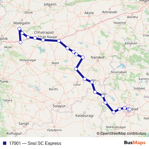 The first stop of the 17001 rail route is Sainagar Shirdi and the last stop is Secunderabad Jn. 17001 (Snsi SC Express) is operational during everyday.