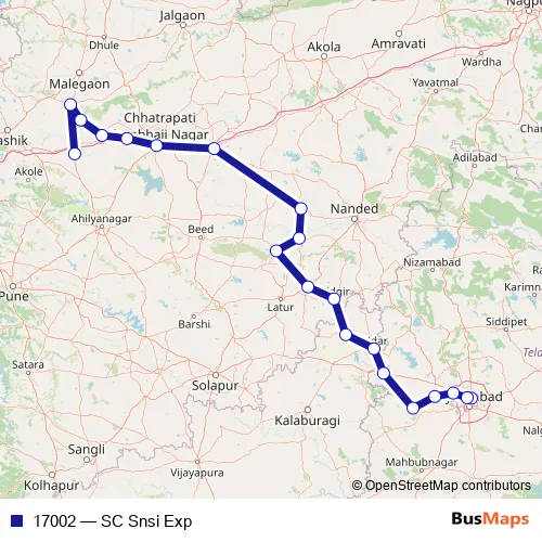 The first stop of the 17002 rail route is Secunderabad Jn and the last stop is Sainagar Shirdi. 17002 (SC Snsi Exp) is operational during everyday.