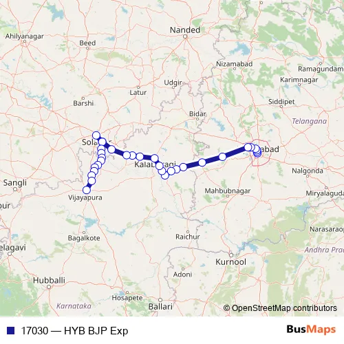 The first stop of the 17030 rail route is Hyderabad and the last stop is Vijayapura. 17030 (HYB BJP Exp) is operational during everyday.