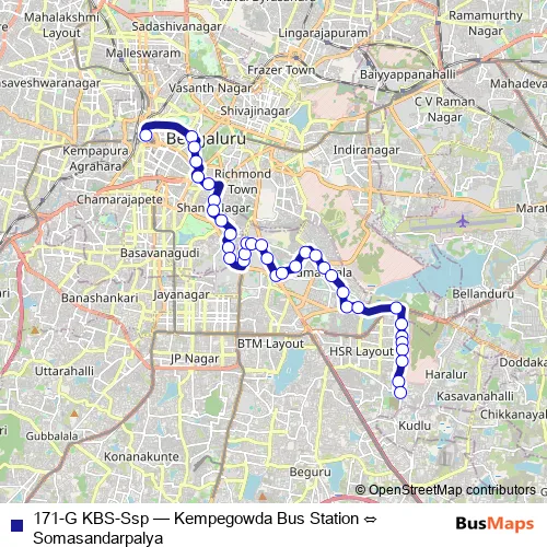 See why over 2 million users trust and consider busmaps.com as the best public transport website. busmaps gives you Bengaluru Buses suggested routes, real-time bus tracker, line route maps in Bengaluru, and helps to find the closest 171-G KBS-Ssp bus stops near you. No internet available? Download an offline PDF map and bus schedule for the 171-G KBS-Ssp bus to take on your trip.