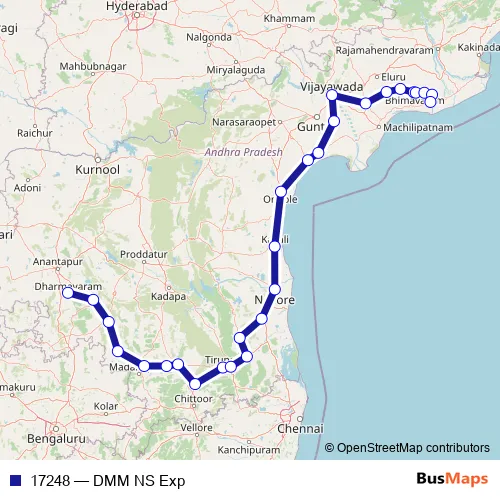 The first stop of the 17248 rail route is Dharmavaram Jn and the last stop is Narasapur. 17248 (DMM NS Exp) is operational during everyday.