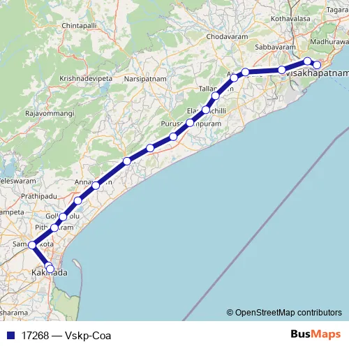 The first stop of the 17268 rail route is Visakhapatnam and the last stop is Kakinada Port. 17268 (Vskp-Coa) is operational during everyday.