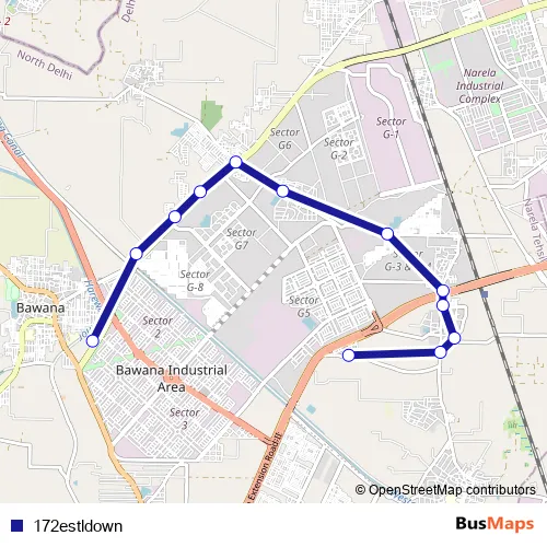 The first stop of the 172estldown bus route is Bawana Sec 1 Cluster Depot and the last stop is Metro Vihar Holambi Khurd Terminal. 172estldown is operational during everyday.