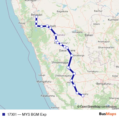 The first stop of the 17301 rail route is Mysore Jn and the last stop is Belagavi. 17301 (MYS BGM Exp) is operational during everyday.