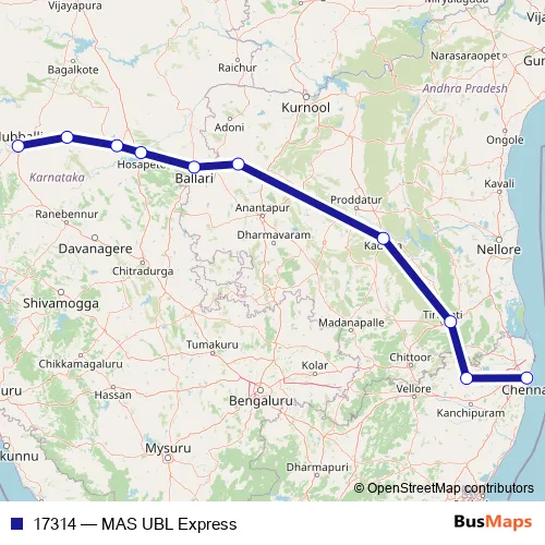 The first stop of the 17314 rail route is Puratchi Thalaivar DR. MGR Ctl and the last stop is SSS Hubballi Jn. 17314 (MAS UBL Express) is operational during everyday.