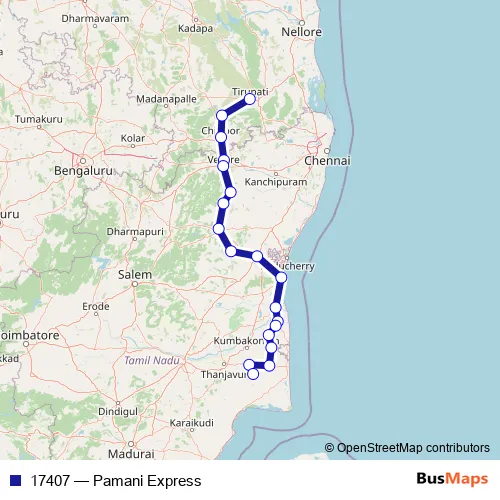 The first stop of the 17407 rail route is Tirupati and the last stop is Mannargudi. 17407 (Pamani Express) is operational during everyday.