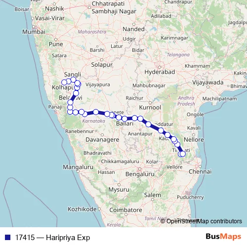 The first stop of the 17415 rail route is Tirupati and the last stop is Kolhapur. 17415 (Haripriya Exp) is operational during everyday.