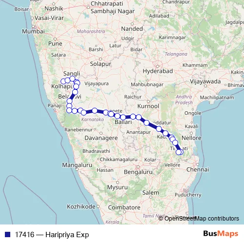 The first stop of the 17416 rail route is Kolhapur and the last stop is Tirupati. 17416 (Haripriya Exp) is operational during everyday.