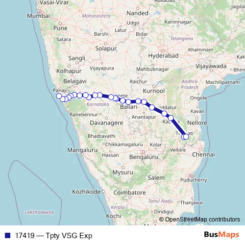 The first stop of the 17419 rail route is Tirupati and the last stop is Vasco DA Gama. 17419 (Tpty VSG Exp) is operational during everyday.