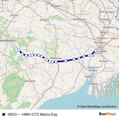 The first stop of the 18033 rail route is Howrah Jn and the last stop is Ghatsila. 18033 (HWH-GTS Memu Exp) is operational during everyday.
