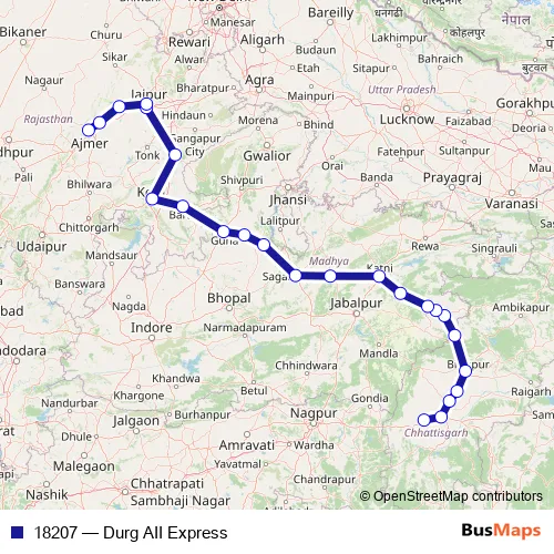 The first stop of the 18207 rail route is Durg and the last stop is Ajmer Jn. 18207 (Durg AII Express) is operational during everyday.