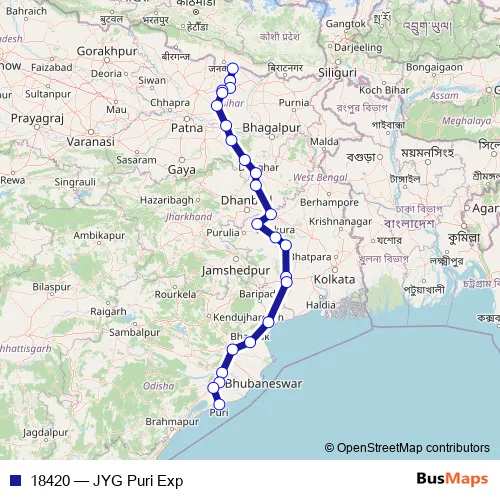 The first stop of the 18420 rail route is Jaynagar and the last stop is Puri. 18420 (JYG Puri Exp) is operational during everyday.