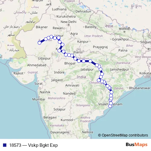 The first stop of the 18573 rail route is Visakhapatnam and the last stop is Bhagat KI Kothi. 18573 (Vskp Bgkt Exp) is operational during everyday.