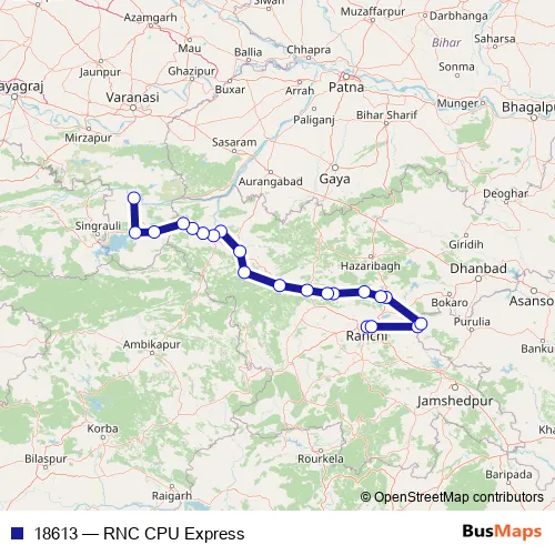 The first stop of the 18613 rail route is Ranchi and the last stop is Chopan. 18613 (RNC CPU Express) is operational during everyday.