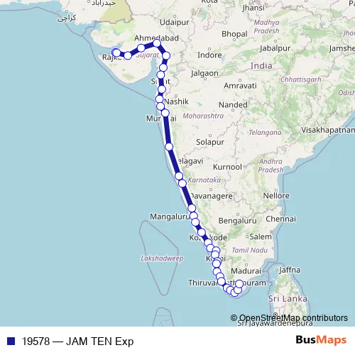 The first stop of the 19578 rail route is Jamnagar and the last stop is Tirunelveli Jn. 19578 (JAM TEN Exp) is operational during everyday.