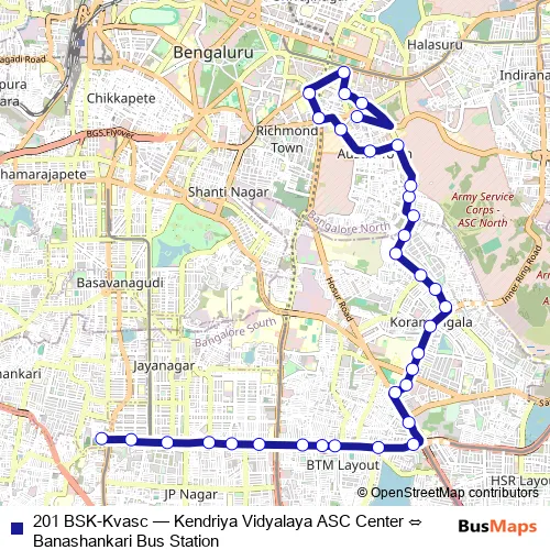 The first stop of the 201 BSK-Kvasc bus route is Banashankari Bus Station and the last stop is Kendriya Vidyalaya ASC Center. 201 BSK-Kvasc (Kendriya Vidyalaya ASC Center ⇔ Banashankari Bus Station) is operational during everyday.