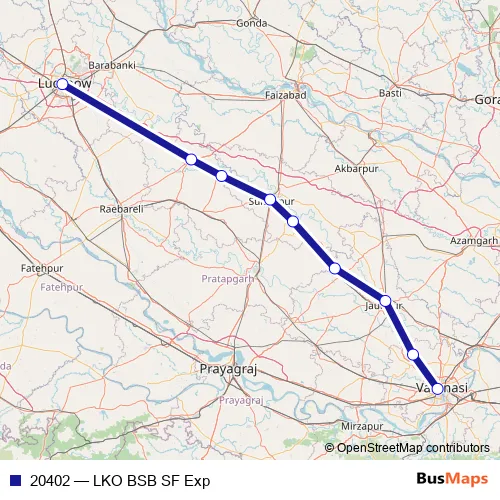 The first stop of the 20402 rail route is Lucknow Jn. and the last stop is Varanasi. 20402 (LKO BSB SF Exp) is operational during everyday.