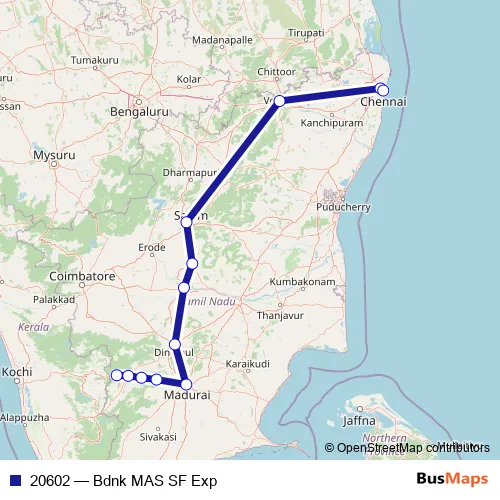 The first stop of the 20602 rail route is Bodinayakkanur and the last stop is Puratchi Thalaivar DR. MGR Ctl. 20602 (Bdnk MAS SF Exp) is operational during everyday.